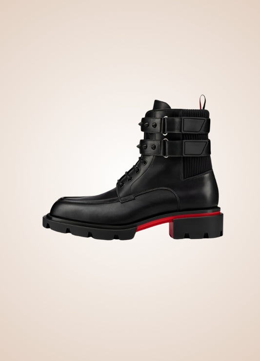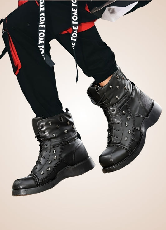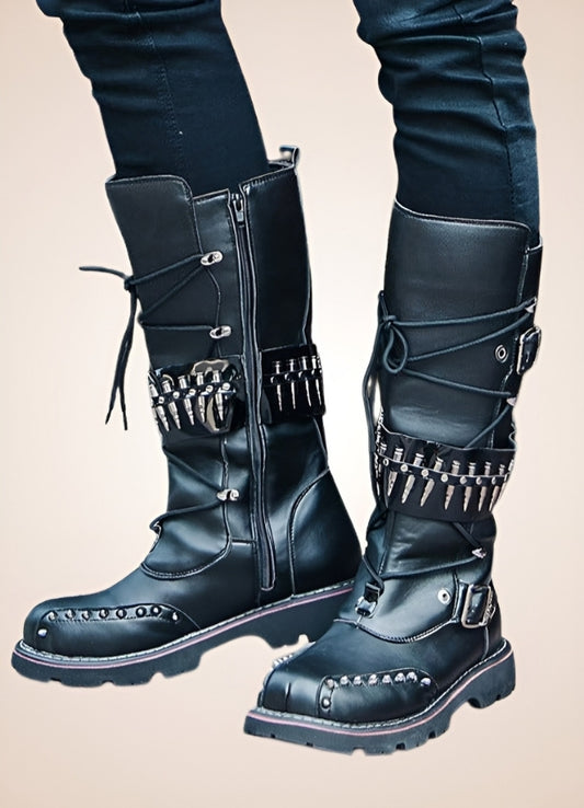 The boots may also integrate metallic elements to enhance the industrial aesthetic. These elements can appear as buckles, rivets, plates, or decorative ornaments. Soles are often made of rubber, ensuring comfort and durability.