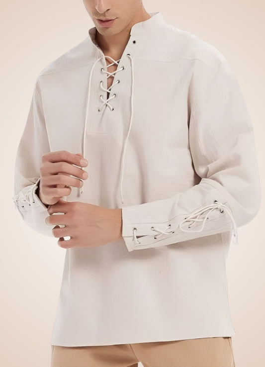 To style a men's steampunk shirt for a UK event, opt for collarless cotton work shirts for a mechanic/inventor look, or ruffled shirts for an "Air Pirate" aesthetic. Pair shirts with classic trousers or rugged denim.