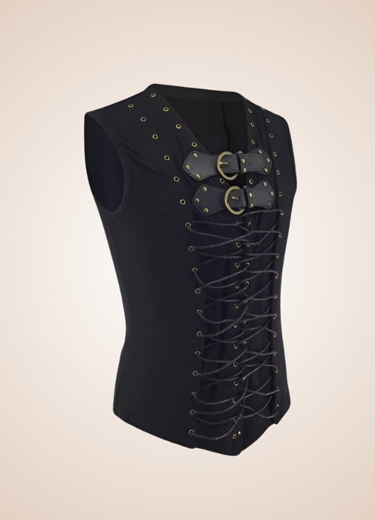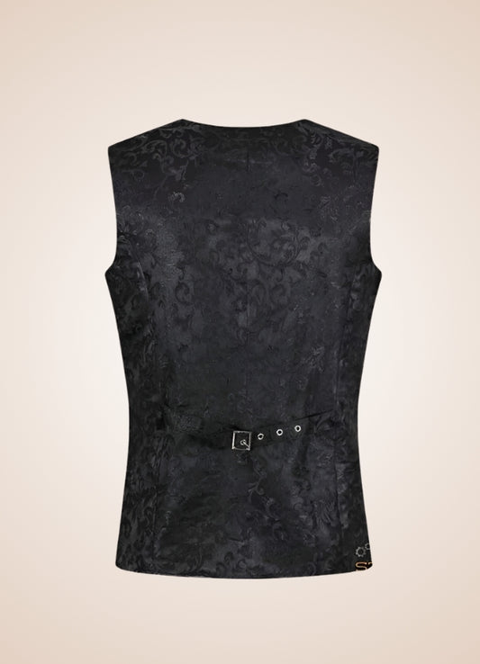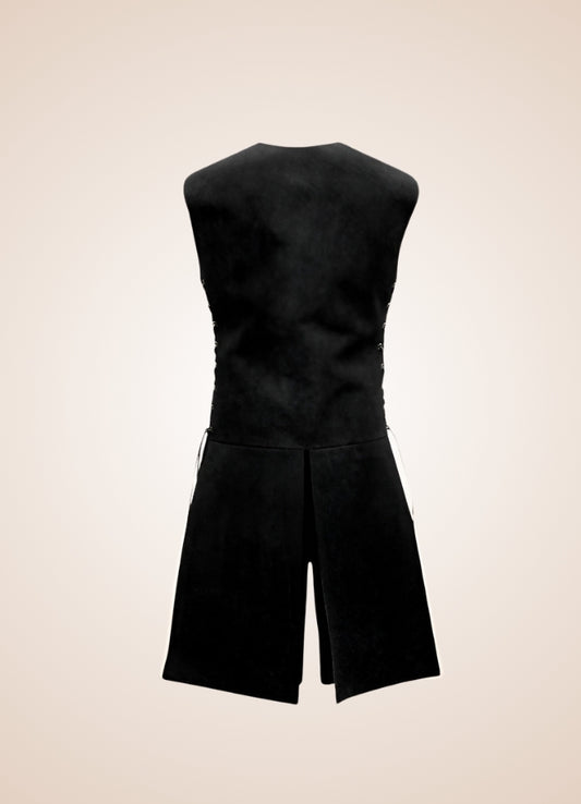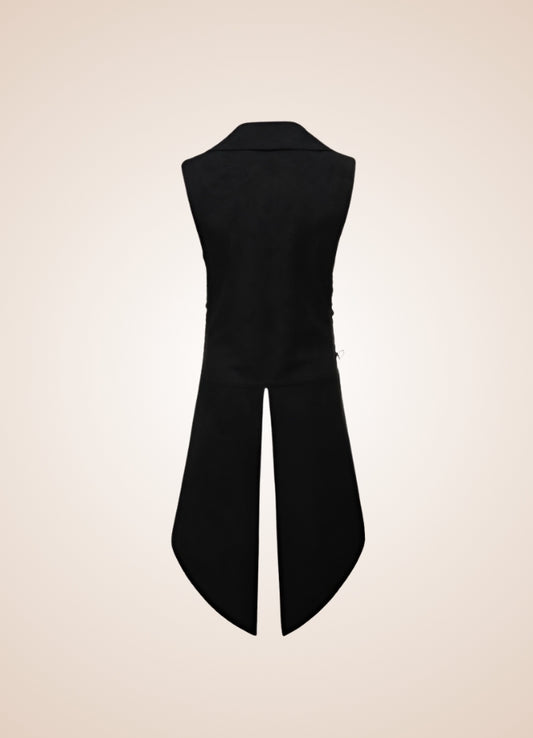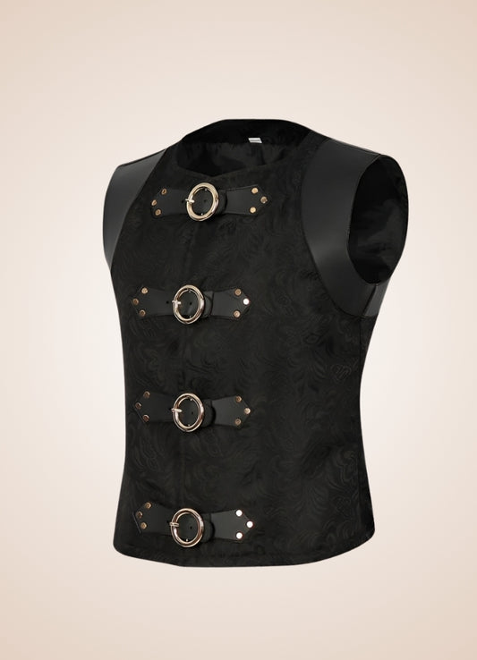 A Steampunk vest is a garment that blends Victorian elegance with industrial-era elements. It often features decorative buckles and is made from materials like black jacquard or leather.
