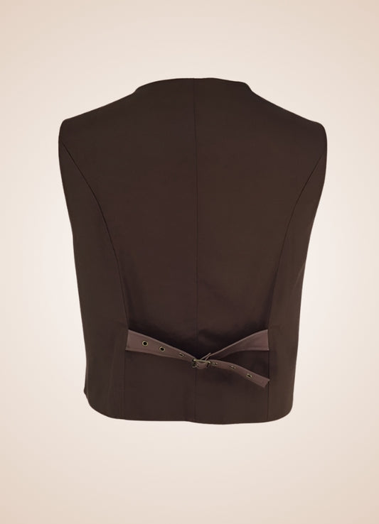 A Steampunk vest is a garment that blends Victorian elegance with industrial-era elements. It often features decorative buckles and is made from materials like black jacquard or leather.