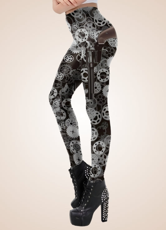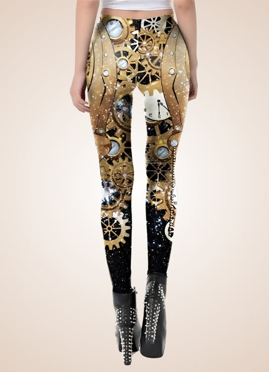 Steampunk leggings showcase intricate gear prints, clockwork motifs, and mechanical designs that capture Victorian-era aesthetics. A standout piece is the Steampunk Mechanical Print Legging, combining intricate detailing with bold design for a truly unique look.